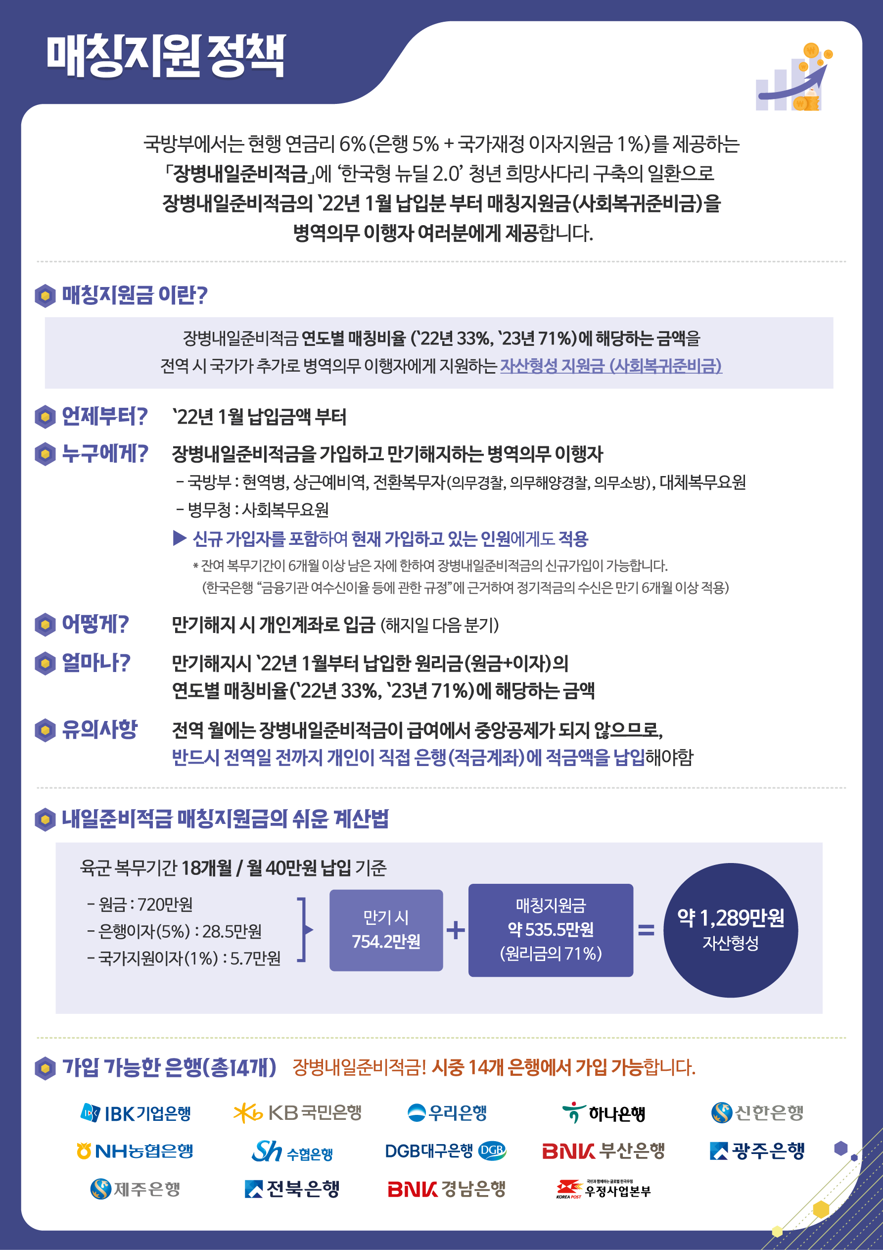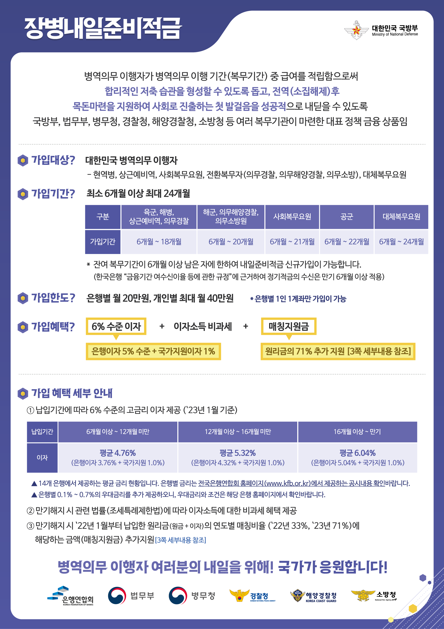 나라를 지키는 고마운 분들에게 이런 제도가 있어서 너무 좋은 것 같습니다. 병역의무 이행기간 중 급여를 적립함으로서 합리적인 저축습관 형성을 돕고, 전역 후 목돈마련을 지원하여 사회로 진출하는 첫 발걸음을 성공적으로 내디딜 수 있는 자산형성을 지원하는 적금제도라고 합니다.