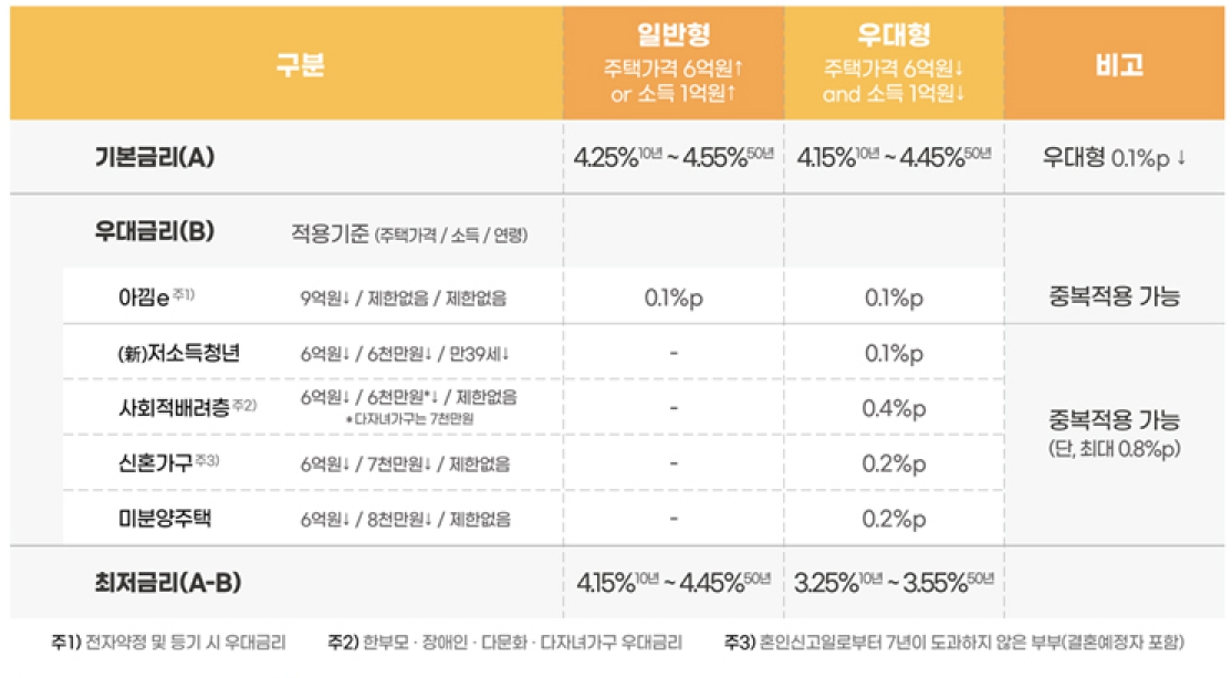 - 대출만기 10,15,20,30,40,50년 (만기 40년은 만 39세 이하 또는 신혼부부 혼인 7년 이내, 만기 50년은 만 34세 이하 또는 신혼부부에 해당)